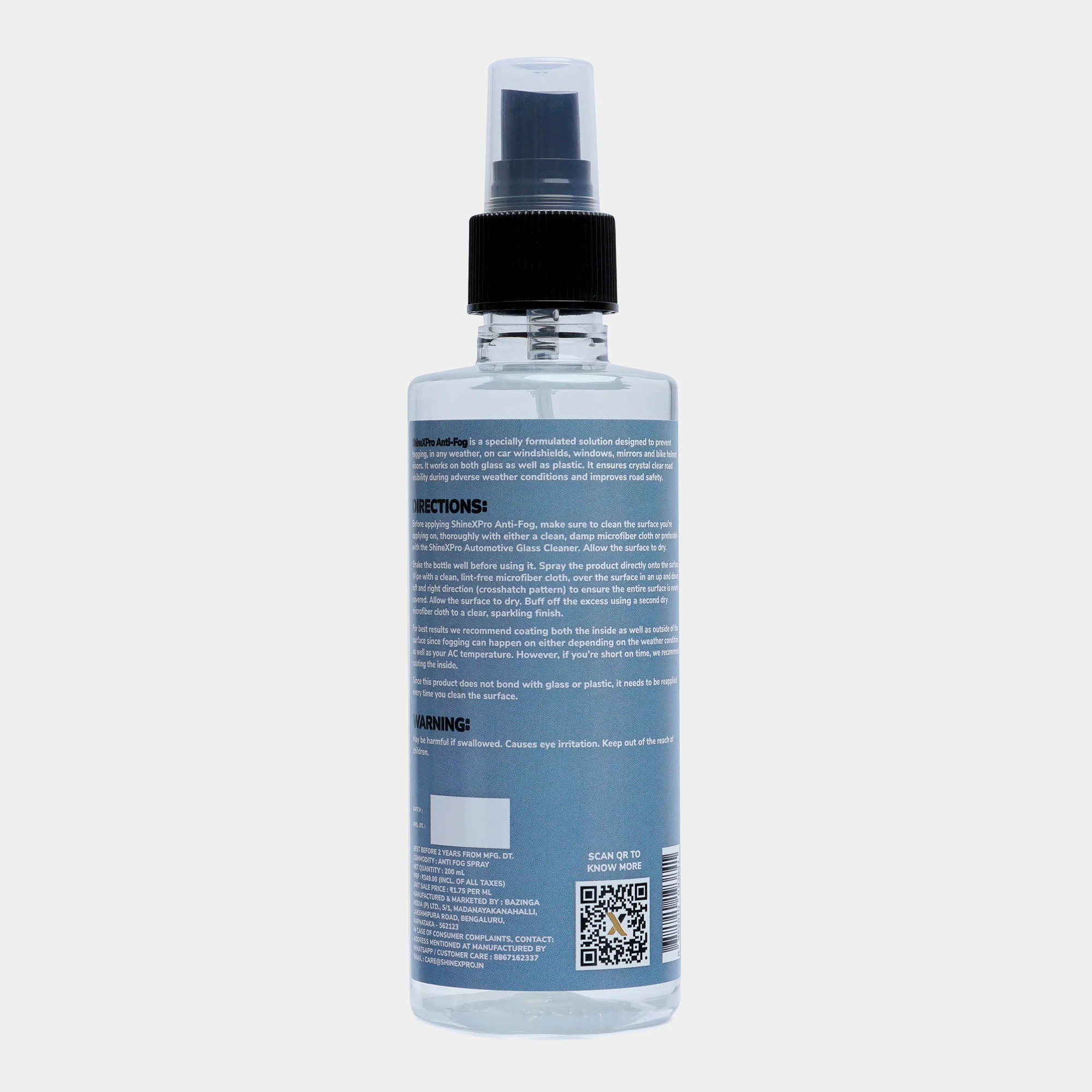 ShineXPro anti fog spray for car windshield, is a specially formulated solution designed to prevent fogging, in any weather condition, on car windshields, windows, mirrors and bike helmet visors. ShineXPro anti fog film for helmet works on both glass as well as plastic. ShineXPro car windshield fog remover ensures crystal clear road visibility during adverse weather conditions and improves road safety & visibility.