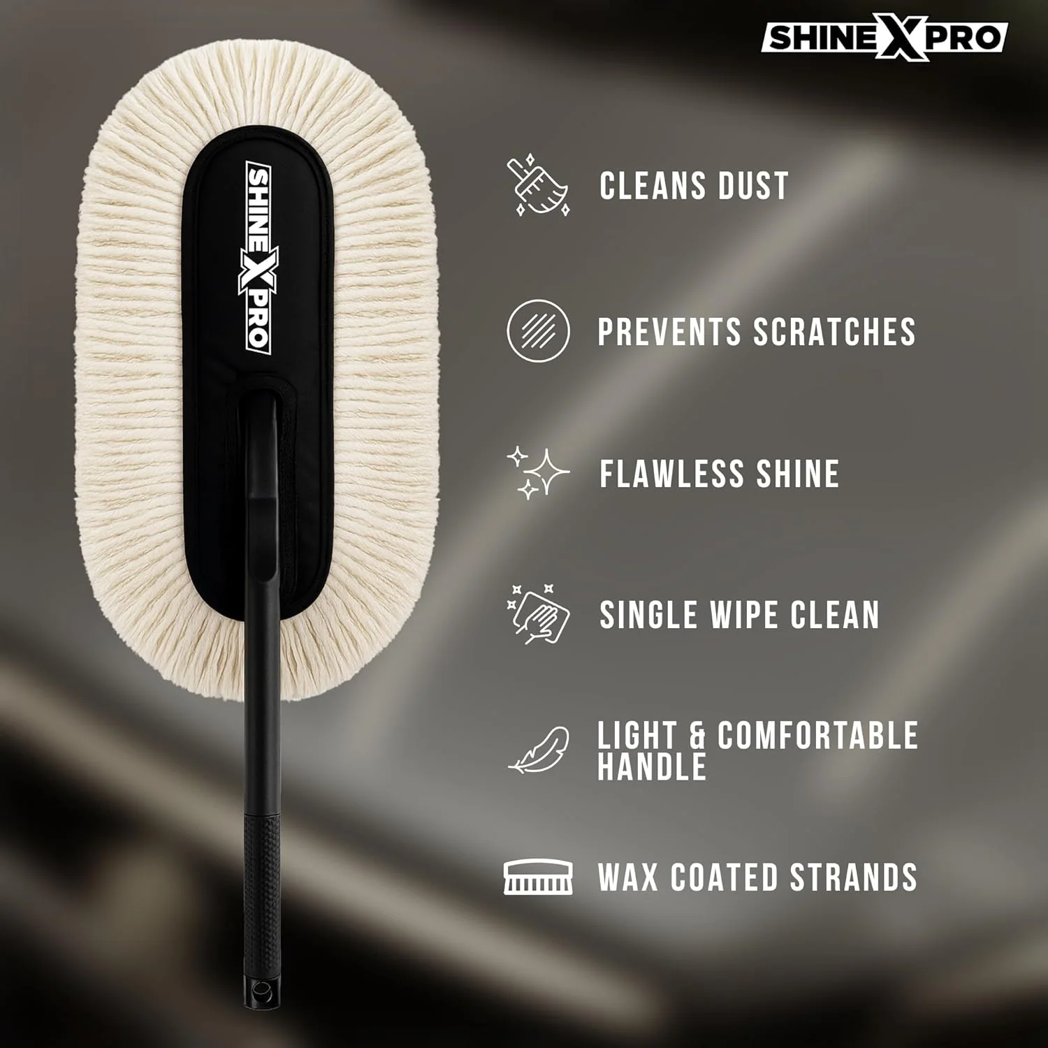 Keep your car spotless in minutes with the ShineXPro Car Duster. Designed for quick, waterless cleaning, it effortlessly lifts dust, dirt, and pollen without sprays or rinsing. The upgraded paraffin wax–coated threads deliver 2x better cleaning power, while the thick, high-density weave traps more dust with every swipe. Safe on paint, glass, and all exterior surfaces, it’s completely lint-free and scratch-free for a flawless shine. Finished with a long, ergonomic, easy-grip handle, the ShineXPro Car Duster lets you comfortably reach roofs, windshields, and corners with ease.