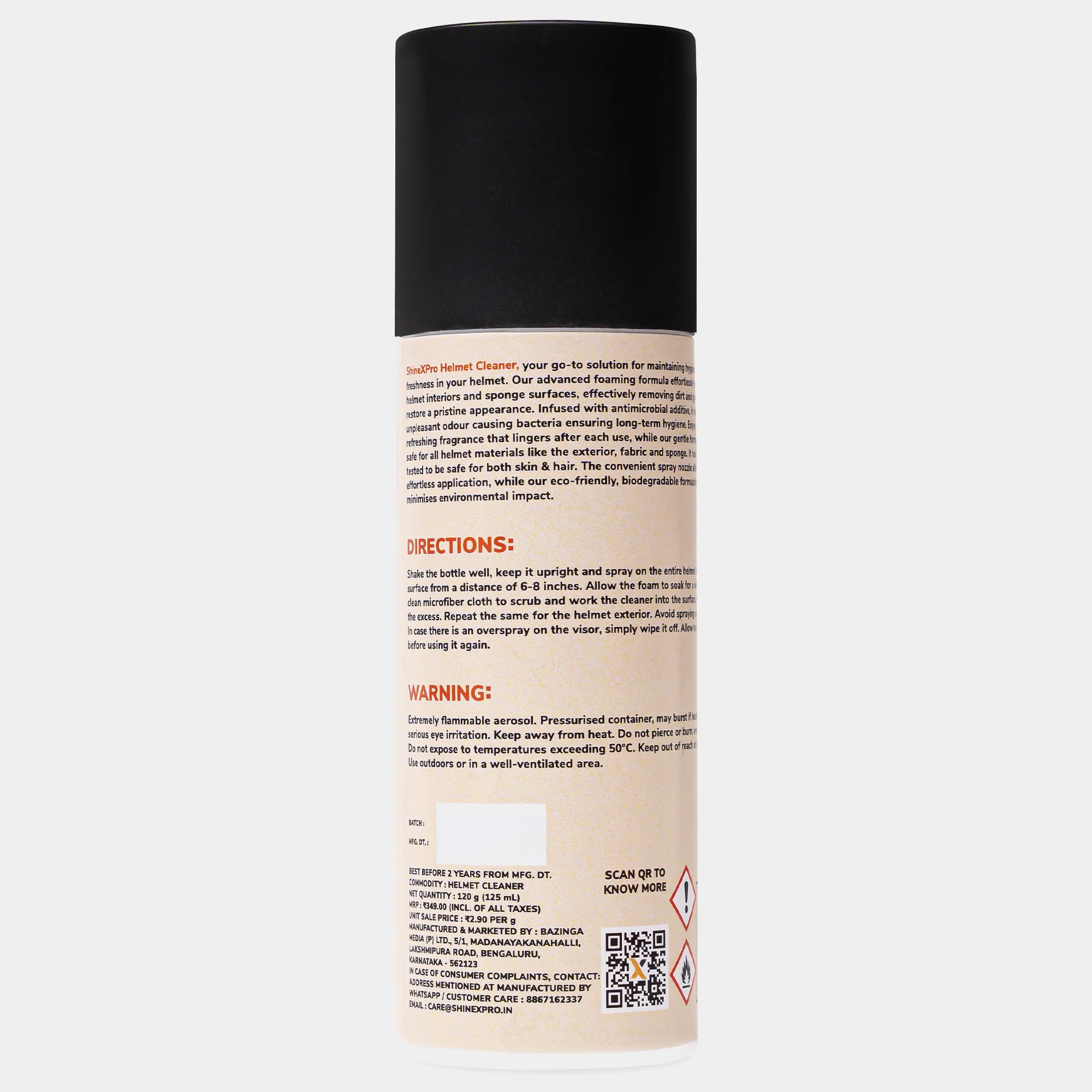 ShineXPro Helmet Cleaner, your go-to solution for maintaining hygiene and freshness in your helmet. Our advanced foaming formula effortlessly penetrates helmet interiors and sponge surfaces, effectively removing dirt and grime to restore a pristine appearance. Infused with antimicrobial additive, it neutralises unpleasant odour causing bacteria ensuring long-term hygiene. Enjoy a refreshing fragrance that lingers after each use, while our gentle formula remains safe for all helmet materials like the exterior, fabric and sponge. It has been lab tested to be safe for both skin & hair. The convenient spray nozzle allows for effortless application, while our eco-friendly, biodegradable formulation minimises environmental impact.