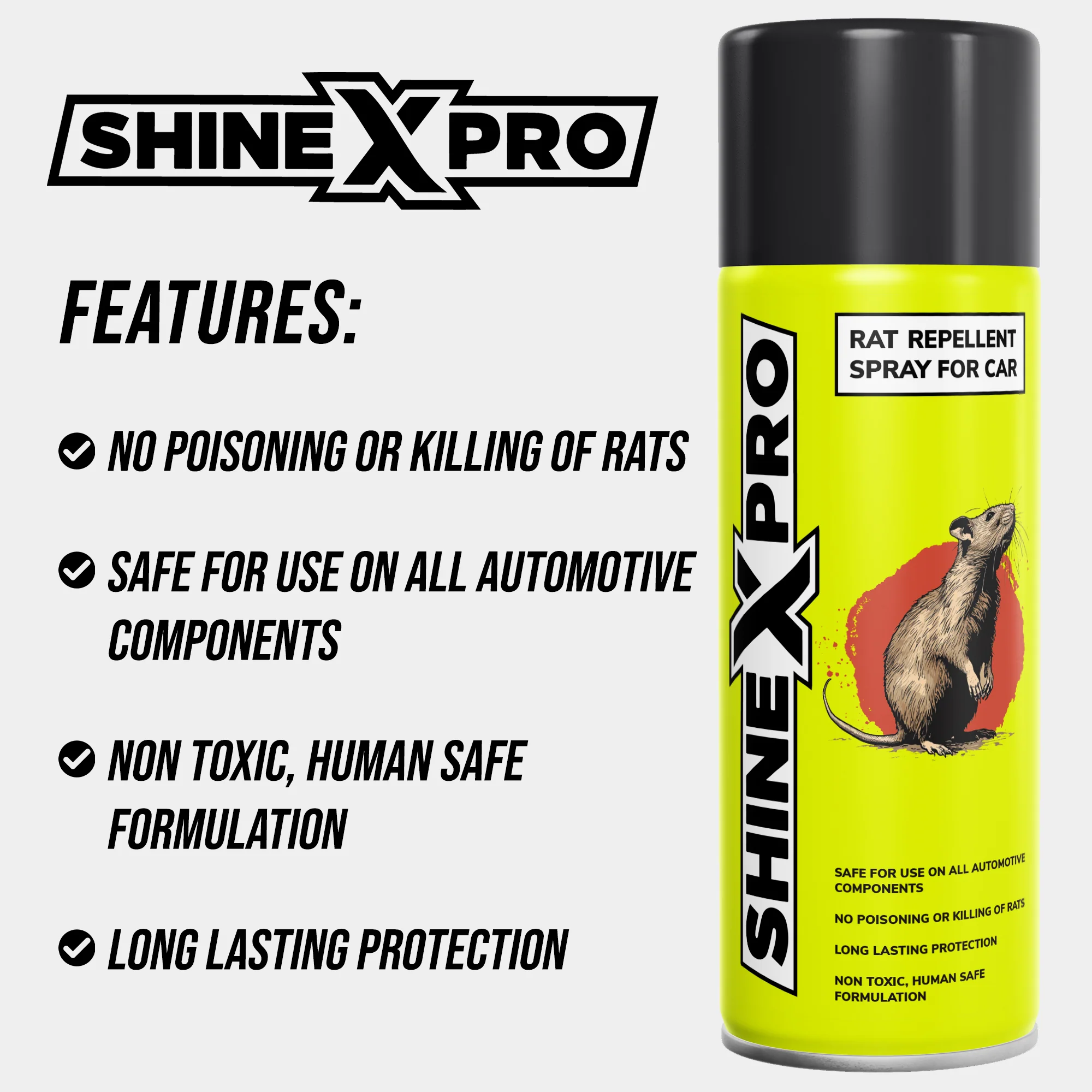 ShineXPro Rat Repellent For Car is a specialised spray designed to deter rats and other rodents from chewing on critical parts of your vehicle, such as the wiring, hoses and insulation because of it's extremely bitter taste. It does not poison or kill the rats. Our rat deterrent for cars uses a European standard non-toxic bitterant which ensures that it is human safe in case of accidental ingestion or inhalation. It comes in an aerosol can with a 360° nozzle which allows for a leak free and easy application even in hard-to-reach areas of your vehicle. ShineXPro rat spray for car is safe for use on all automotive components including electrical wires, fuel lines, tyre arch and undercarriage parts.