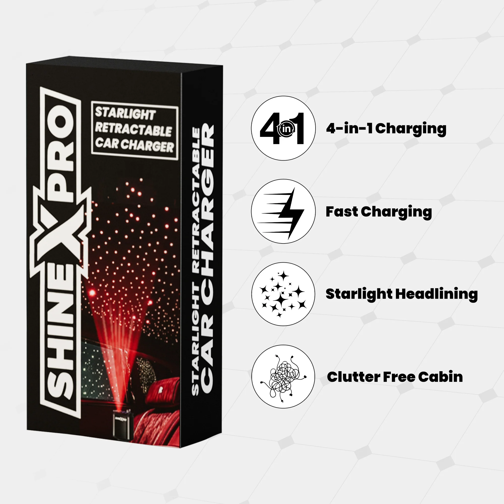 Introducing ShineXPro StarLight Retractable Car Charger - a solution to avoid keeping multiple messy, dangling charging cables and instead have retractable wires and a single charger which can charge 4 devices simultaneously. It comes with fast charging capabilities which can charge your laptop as well. The inbuilt starlight transforms the roof of your car into the illusion of a star-filled night sky.